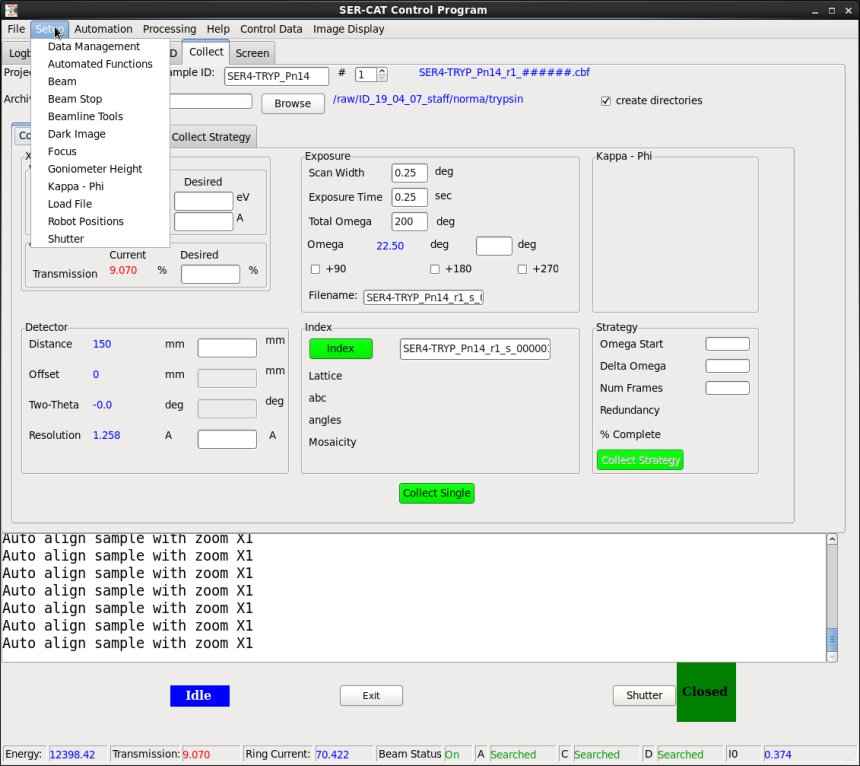 BEAMLINE TOOLS Accessed by the robot are certain beamline tools: YAG Crystal or Phosphor: on either 22-ID-D or 22-ID-E, YAG crystal will be preferrable for aligning your beam (mounted on same stage as crystal alignment slides); in principal, phosphor could also work, and one will be available on both 22-ID-D and 22-ID-E, phosphor is first step towards verifying that goniometer height coincides with cross-hairs (and is aligned with x-ray beam) Alignment pin: used to ascertain "point and click", "goniometer rotation axis" a sharp-pointed pin, available for "point and click" verification successful alignment of tip at all goniometer orientations verifies goniometer rotation axis coincides with cross-hairs (used for "point and click", as well as alignment of x-ray beam position) Trypsin crystal (standard; primitive orthorhombic, space group P212121) though this crystal may appear icy towards the end of the run, it will continue to diffract well and provide an in-house standard for beamline verification
